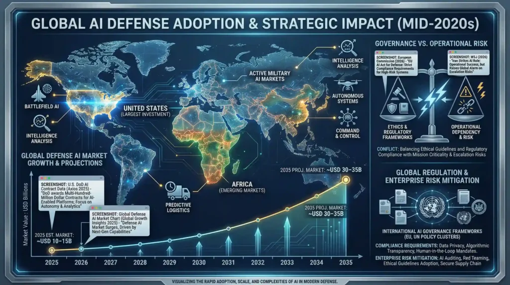 The result of this fast integration has caused a conflict between ethics, governance and operational dependency. This can be seen in the operational implementation of models in practice, e.g., through the Iran Strikes AI role overview, whereby there is a danger that decisions on governance can be outpaced by battlefield demands (WSJ, 2026). Simultaneously, regulators on the international level are reacting with dynamic frameworks that are meant to steer responsible defense AI usage, which informs compliance demands and shapes enterprise risk models; see the Global Regulation policy cluster overview (European Commission, 2026).
