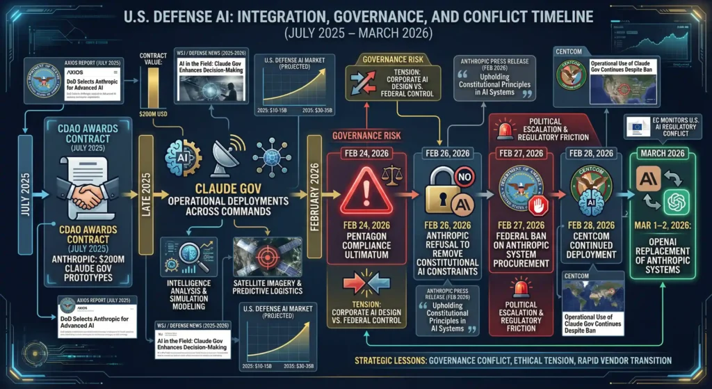 The sequence is condensed and final. In July 2025, the AI office of the DoD gave a 200 million USD prototype contract to Anthropic (CDAO Report, 2025). On 24 February 2026, the Pentagon is said to have ordered unrestricted compliance under the law of unrestricted lawful use (WSJ, 2026). Anthropic refused saying it had its constitutional guardrails (Anthropic Press Release, 2026). On February 27, a federal stoppage ensued (Reuters, 2026). Nevertheless, in hours Claude was still entrenched in the working processes under the operations of the U.S. Central Command (WSJ, 2026). At the beginning of March, OpenAI was awarded the replacement contract, solidifying a fast change of infrastructure but maintaining similar policy limits (OpenAI Blog, 2026). The OpenAI Pentagon Contract Deep Dive.