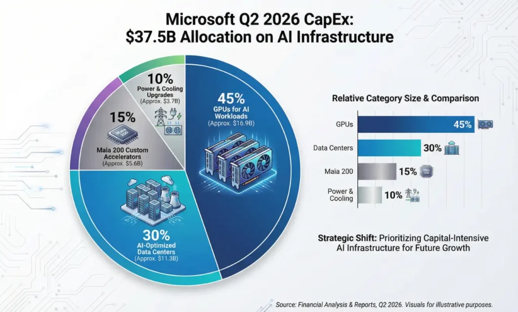 A: Microsoft has already announced USD 37.5 billion of capital spending, which is concentrated on AI-optimized data centres, graphic card buying, bespoke accelerators (Maia 200), and network infrastructure. This type of investment indicates the transition to the AI-industrial platform.